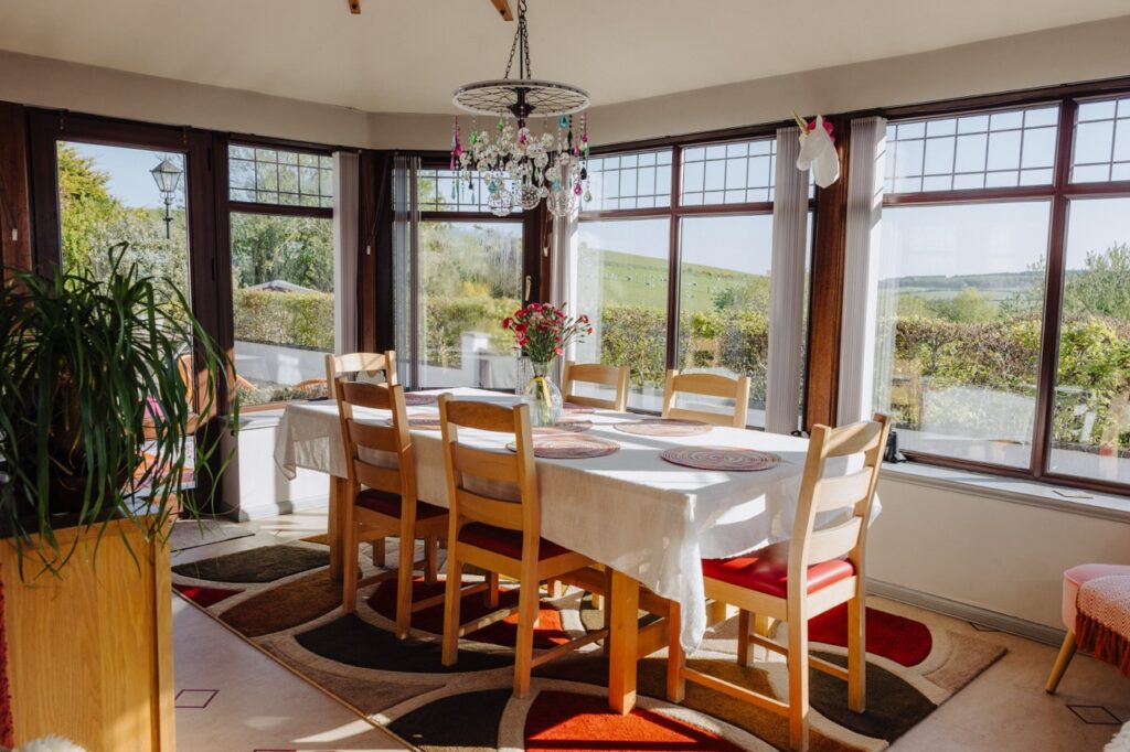 Spacious sun lounge with large dining table and countryside views