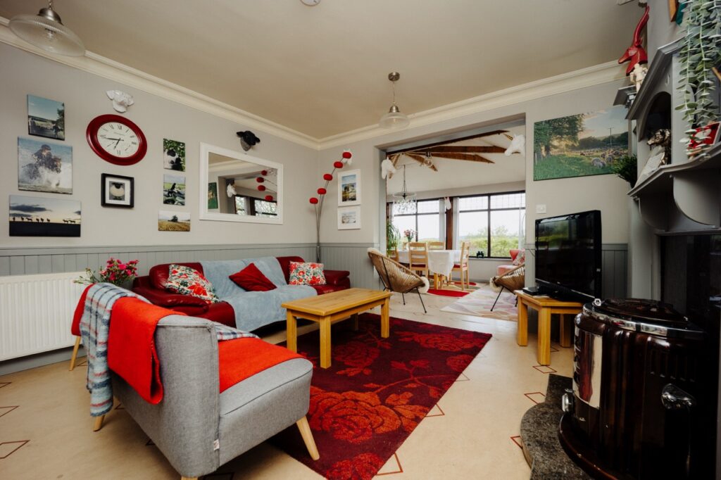 At the heart of the house is a warm and welcoming communal area — a cosy sitting space complete with a traditional log-burning stove, perfect for curling up with a good book or enjoying a chat over a glass of wine. This space opens into a beautifully equipped, country-style farmhouse kitchen, ideal for preparing hearty breakfasts or indulgent evening meals.